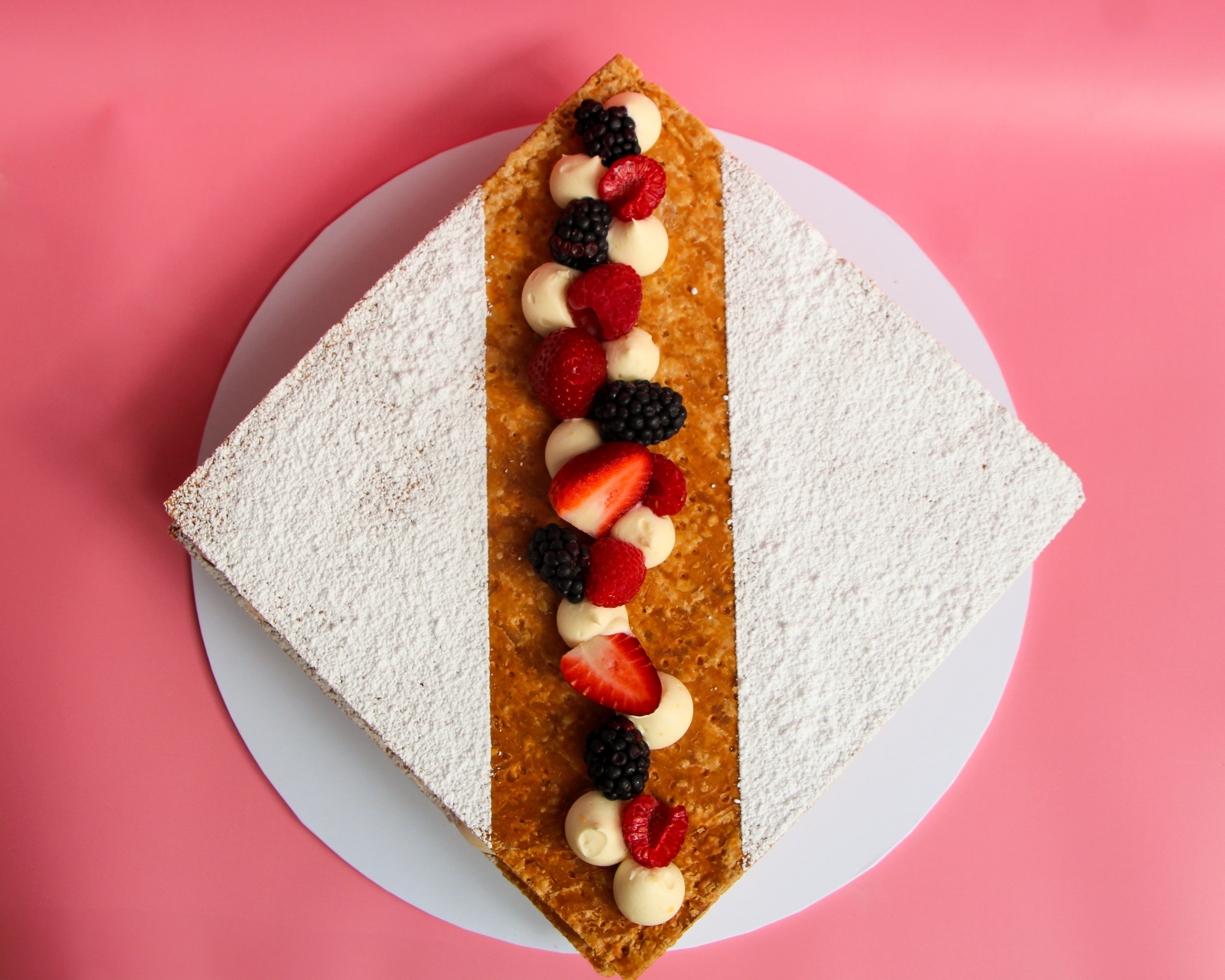 The puff is laminated in our kitchen - no shortcuts, no pre-made anything, just pure technique and a lot of butter. The creme diplomat is a french custard folded through with whipped cream to lighten it. The result? it's indulgent, deliciously messy and and absolutely worth every single crumb on your plate.