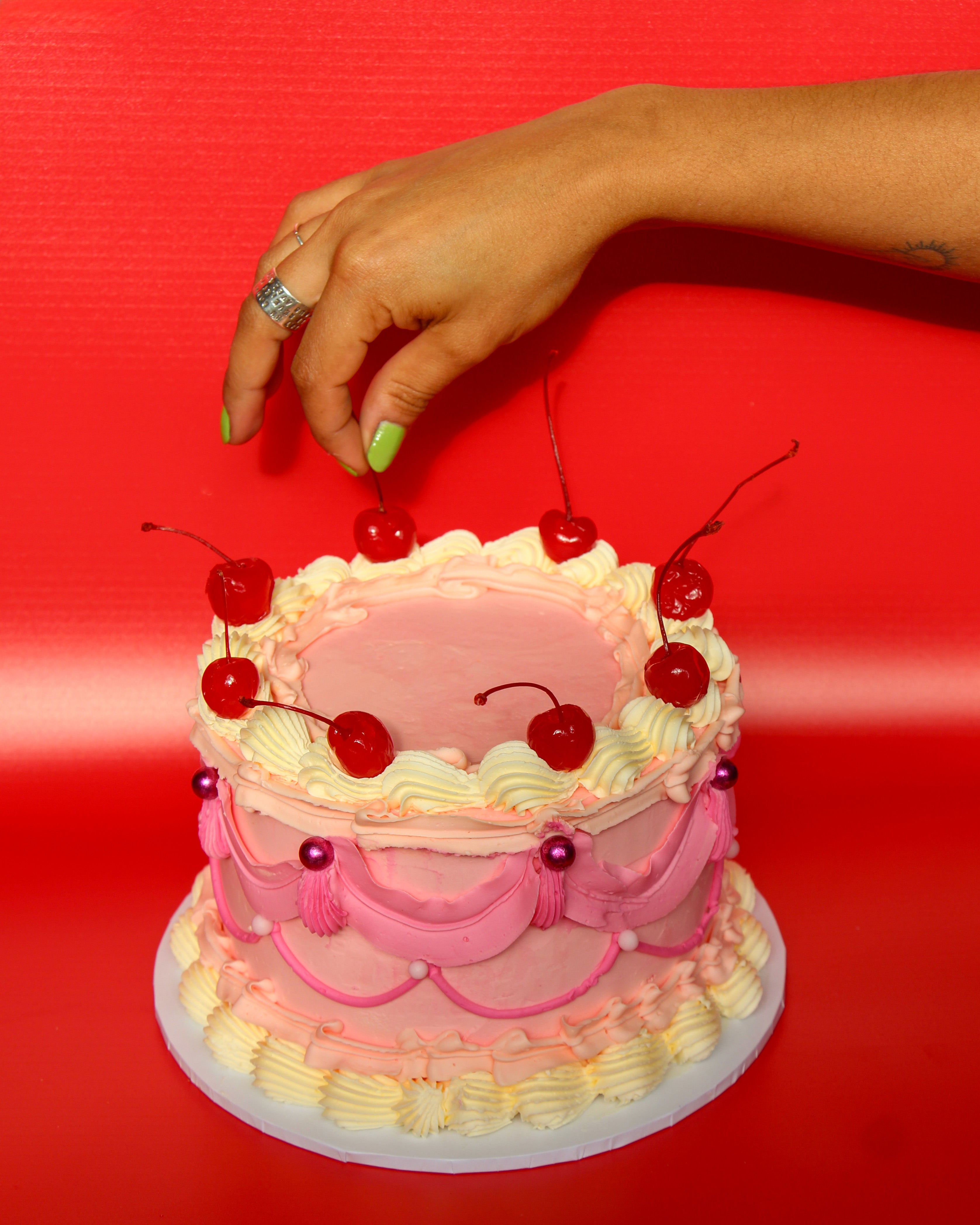 Meet the cake that's giving us all the vintage vibes and making our hearts skip a beat. Top her off with those iconic maraschino cherries for the full retro experience, or keep it simple - she's a stunner either way.