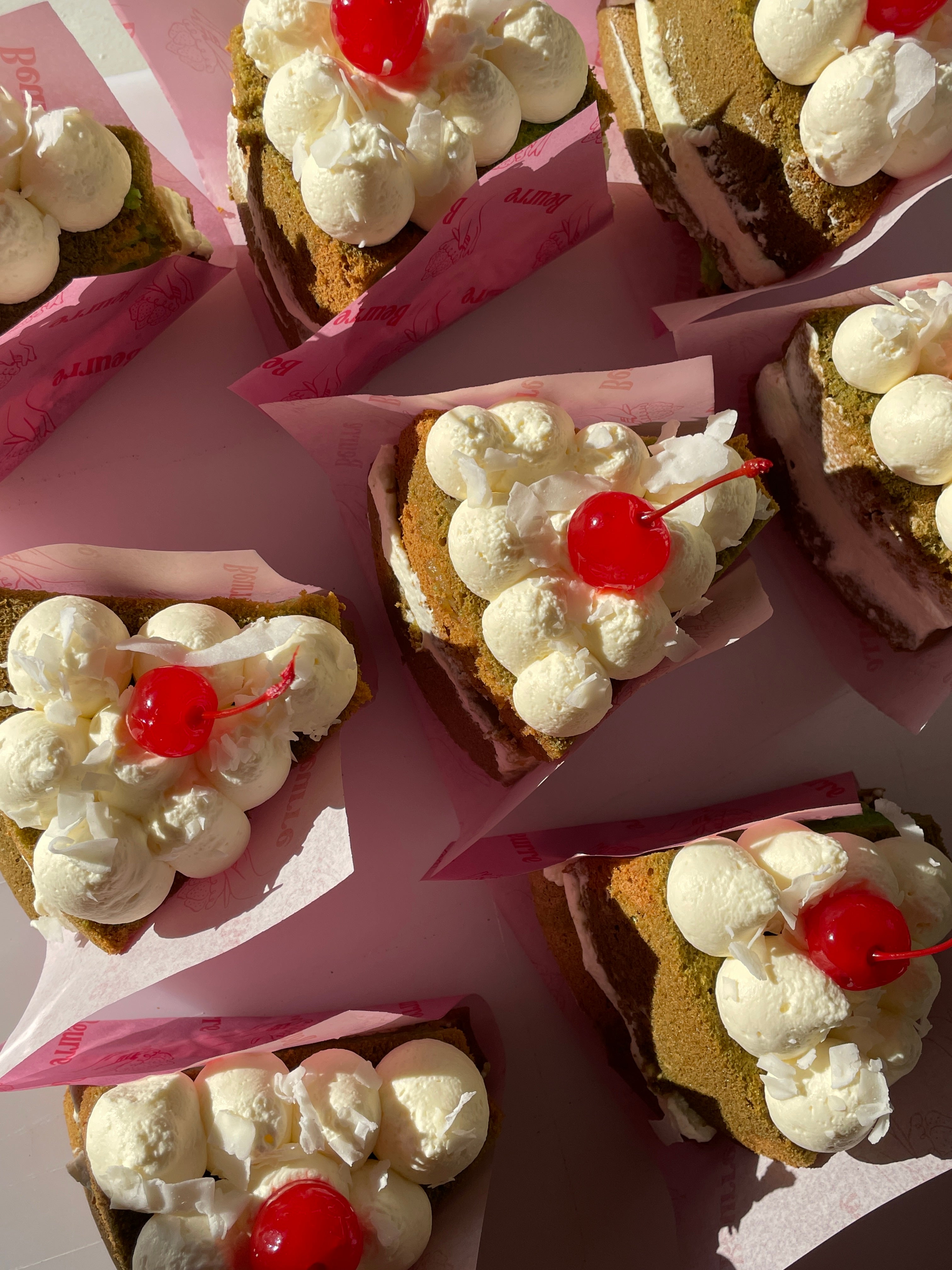 The airiest pandan chiffon, filled with kaya (a type of coconut jam) and mascarpone Chantilly. Our greatest compliment that we receive with this cake is that it’s ‘not too sweet’.